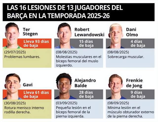 特尔施特根已经休战93天;8月份,莱万多夫斯基受伤休息15天、奥尔莫休战一周;8月底,加维休战2个月。进入9月份,巴萨的伤病潮更为严重,巴尔德、德容、亚马尔、费尔明、拉菲尼亚、霍安-加西亚6人受伤!