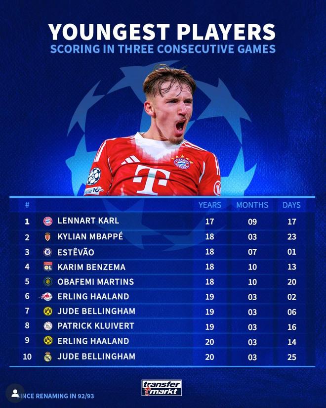 赛后Opta统计出了自1992-93赛季欧冠改制以来连续三场进球最年轻的10名球员,伦纳特-卡尔超越姆巴佩排名第一。
