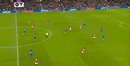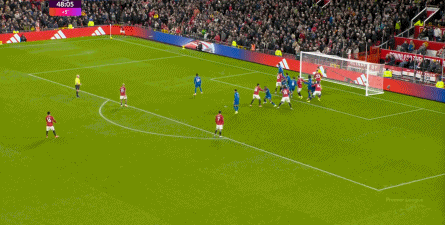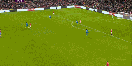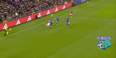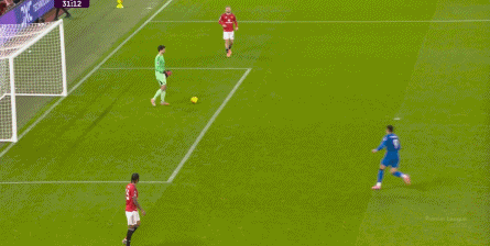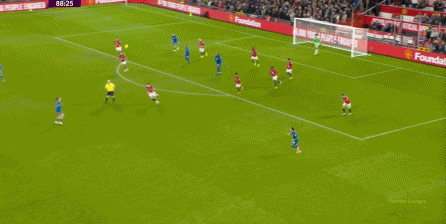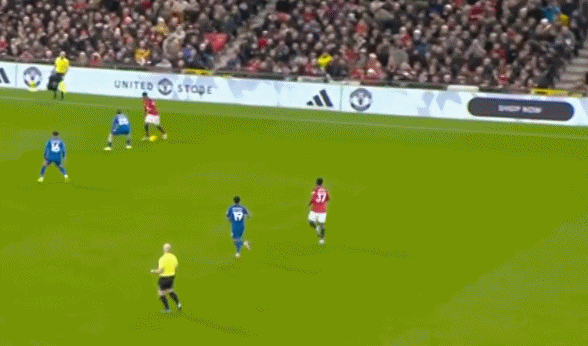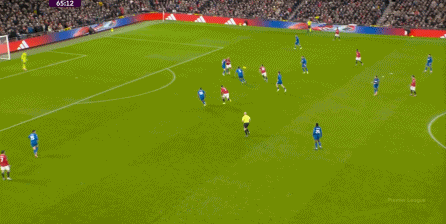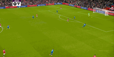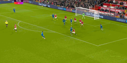所以在4-4之后,曼联的表现反而大不如前,连424的冲击盛景也很难出现了,唯一的一次好机会,还是起自库尼亚的单打和横移,但布鲁诺在右侧送上传中的时候,你可以说他的球速太快了,发力太重了: