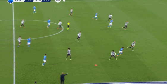 就算阿玛德-迪亚洛和姆贝乌莫可以视为换位,前者来不及落位,但他不防后上球员,姆贝乌莫不对持球人上强度,任凭对手起脚转移:
