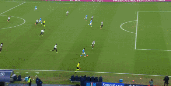而且在本方的一次长球下来,梅努和多尔古先是争到同一点,随后两人又被先后穿过去,让塞门约又在空旷的禁区弧前得到了和队友配合的空间: